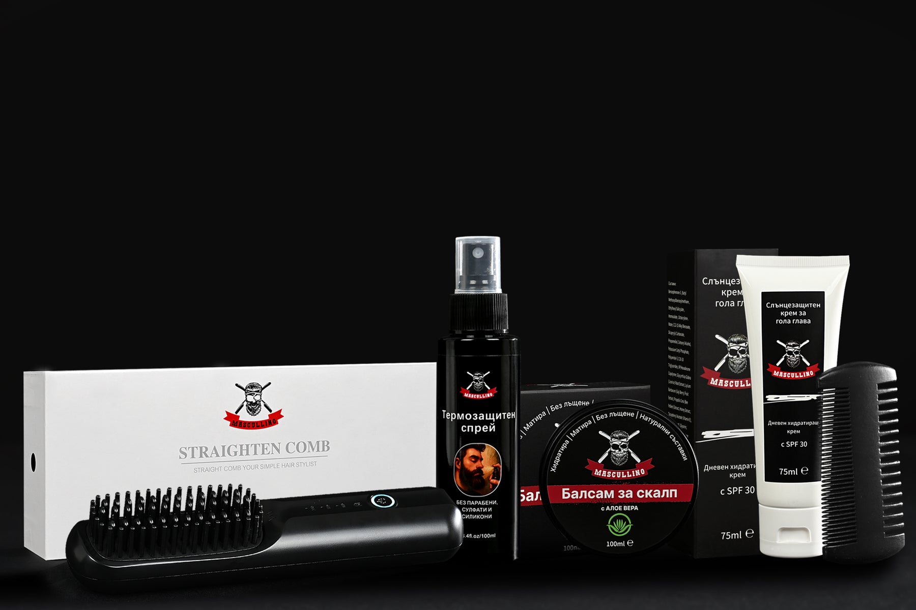 Комплектът се допълва от класическия гребен на Mascullino – компактен, удобен и идеален за финално стилизиране след нанасяне на олио или балсам.